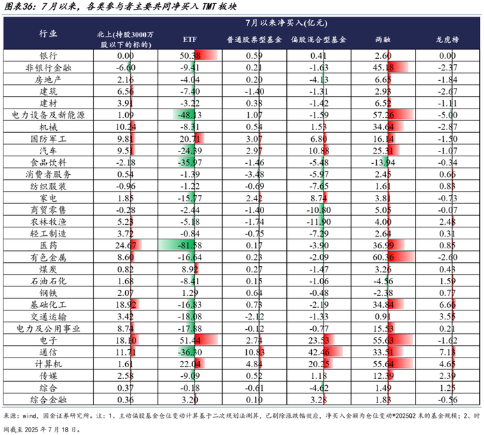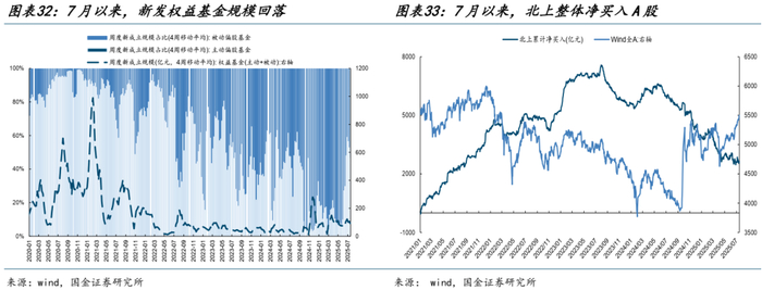 7月以来个人投资者再度成为市场的主要增量资金,相应地,主动偏股基金仓位继续上升、北上有所回流。各类参与者一度形成明显的合力,而近期北上与机构ETF再度净流出,其与个人投资者的分化开始加剧。行业上看,上述各类参与者主要共同净买入TMT板块,这进一步推升了二季度主动偏股基金内部定价较为极致的板块。但从负债端来看,7月以来新发权益基金规模回落且仍以被动基金为主,即主动基金资产端共识与增量资金共同推动的超额回报可能暂时依然未能带来负债端的持续增量资金,反而可能依然受制于存量持有者的行为,如回本赎回等。这意味着结合主动基金持仓的“反转特征”(持仓比例较高的往往在未来可能表现相对较差)与增量资金(个人、险资等)偏好,在当下依然是可以用于比较不同板块交易结构的线索。未来主动基金重获定价权的重要观测指标,我们认为依然是在主动基金取得良好业绩的前提下,负债端能够逐步回流以增强资产端表现从而形成良性循环。