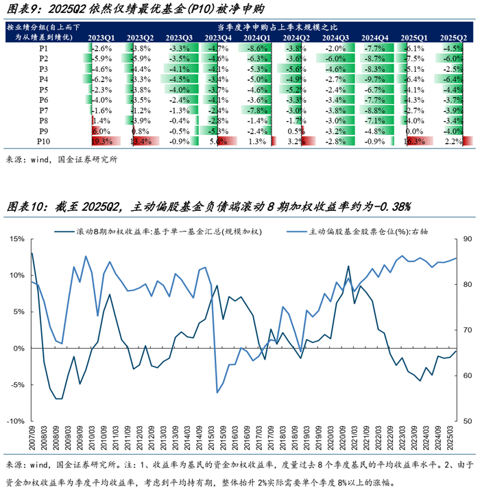 更进一步地,从不同业绩分组来看,主动基金内部分化依然明显:平均而言,2025Q2仅业绩排名前10%的基金才能够获得负债端的增量资金,且增量比例相较于一季度有所回落。另一方面,从负债端的8期滚动持有收益率来看,当前主动基金持有人过去8个季度的平均持有回报即将转正,而这从历史经验来看往往是赎回概率较大的区间(回本赎回)。