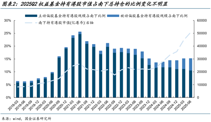 结合南下来看,2025Q2南下资金单季度净买入2728.63亿元,较一季度明显回落,而权益基金持有港股市值占南下的比例变化变化不大(2025Q2的15.19%vs2025Q1的15.16%),但结构上“被动化”的趋势依然在延续,其中,被动偏股基金持有港股市值占南下比重从2025Q1的4%上升至2025Q2的4.62%,相应地,主动偏股基金持有港股市值占南下比重则从2025Q1的11.15%回落至2025Q2的10.58%。整体而言,本轮南下资金的主要力量可能仍来自于公募之外(险资、个人等)。
