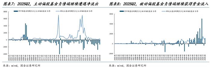 2)对于被动偏股基金,2025Q2其新成立规模小幅上升,整体维持在930亿以上,相应地,存量部分重新被净申购。整体来看,其负债端增量资金从2025Q1的572.32亿元再度回升至2025Q2的2045.16亿元。与主动相对应的是,被动偏股基金的负债端(新发+净申购)已经连续9个季度获得大量增量资金。