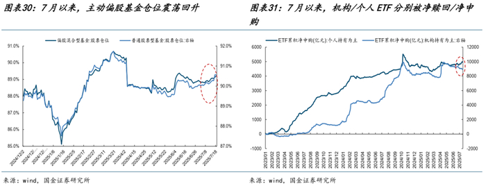 个人投资者在经历二季度的“退潮”之后,7月以来再度成为市场的主要增量资金:一方面两融活跃度与余额自7月以来持续回升,相应地,龙虎榜的活跃度在先经历回落之后也逐步回升;另一方面,机构持有为主的ETF被净赎回的同时,个人持有为主的ETF继续被净申购。相应地,主动偏股基金仓位继续上升、北上资金有所回流。各类参与者一度形成明显的合力,而近期北上与机构ETF再度净流出,其与个人投资者的分化开始加剧。