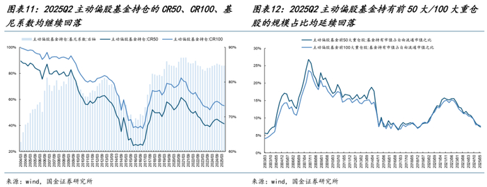 2025Q2主动偏股基金的持仓集中度继续回落,具体来看,无论是主动偏股基金的持仓的CR50、CR100,还是持仓的基尼系数均继续回落,叠加负债端的继续“缩圈”,主动偏股基金对于前50大/100大重仓股的持仓规模占自由流通市值的比例也均延续回落。