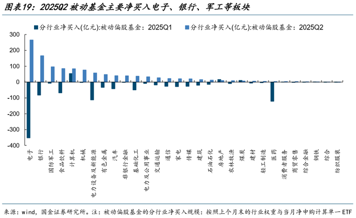 一方面,穿透来看,ETF在二季度净买入大多数行业,且主要集中在电子、银行、军工、食品饮料、计算机等行业,即ETF与主动基金在电子、银行、军工等板块形成共振,但又在食品饮料、计算机等板块互为对手盘;