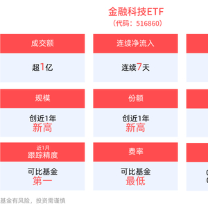 从资金净流入方面来看,金融科技ETF近7天获得连续资金净流入,最高单日获得7639.14万元净流入,合计“吸金”2.84亿元,日均净流入达4056.39万元。
