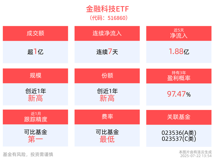 截至7月21日,金融科技ETF近1年净值上涨124.33%,指数股票型基金排名3/2929,居于前0.10%。从收益能力看,截至2025年7月21日,金融科技ETF自成立以来,最高单月回报为55.92%,最长连涨月数为3个月,最长连涨涨幅为113.16%,上涨月份平均收益率为10.60%,年盈利百分比为66.67%,历史持有3年盈利概率为97.47%。截至2025年7月21日,金融科技ETF成立以来超越基准年化收益为0.51%。