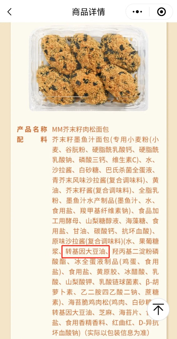 山姆会员商店小程序购物平台显示,该款MM芥味籽肉松面包的配料表中,确有“转基因大豆油”成分。