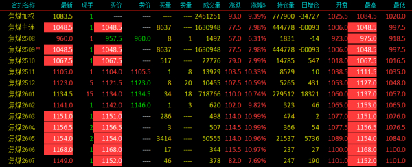 焦煤连续两个交易日大涨,主力jm2509午后触及涨停,现报1048.5元/吨,涨幅7.98%;持仓了444715手,减仓60156手。多只远月合约大涨或涨停。消息面,国家能源局发布通知,严查煤矿企业“以量补价”,超公告产能组织生产,严重扰乱煤炭市场秩序。