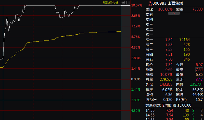 截至下午收盘,Wind煤炭指数涨6.45%,山西焦煤、昊华能源、潞安环能、山煤国际等多只个股收于涨停板。