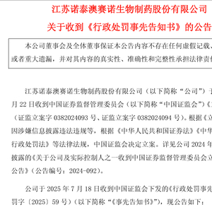 7月18日,诺泰生物(688076)收到中国证监会《行政处罚事先告知书》,因其涉嫌信息披露违法违规及欺诈发行,证监会拟对公司及相关责任人作出行政处罚。