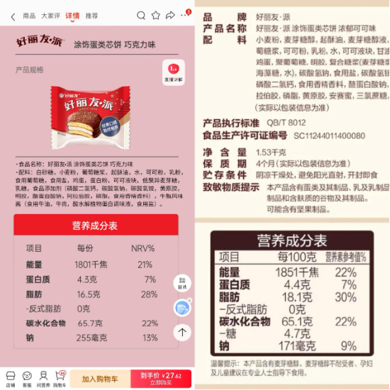 从营养成分表看,低糖好丽友派的碳水化合物含量为65.1g/100g,和普通好丽友派的65.7g/100g含量差异甚小,而热量、脂肪含量甚至高于普通好丽友。