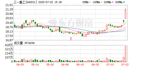 7月22日,临近A股收盘,三一重工、中联重科等工程机械龙头股突然暴力拉升。其中,三一重工一度触及涨停。截至收盘,工程机械板块整体涨幅超过6%,铁建重工、厦工股份、山河智能等超10只个股涨停,三一重工涨近9%,中联重科涨近8%。