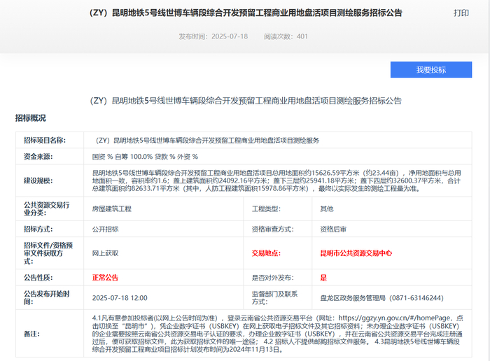 7月18日,云南公共资源交易服务平台发布了“昆明地铁5号线世博车辆段综合开发预留工程商业用地盘活项目测绘服务招标公告”和“昆明地铁5号线世博车辆段综合开发预留工程商业用地盘活项目全过程造价咨询服务及工程竣工决算编制服务招标公告”,标志着这一TOD(以公共交通为导向的开发)商业项目进入实质性推进阶段。