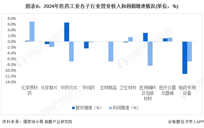 根据国家统计局数据,2024年规模以上医药工业增加值同比增长3.4%;化学原料药、医疗仪器设备及器械两个子行业营业收入和利润实现双增长;中药饮片、生物制品、药用辅料及包装材料等3个子行业利润为负增长;化学制剂、中成药、制药专用设备等3个子行业营业收入和利润均为负增长。