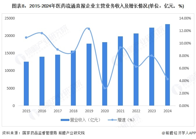 2015-2024年,医药流通直报企业收入不断增长,根据国家药品监督管理局数据显示,2023年,全国药品流通直报企业主营业务收入22362亿元,扣除不可比因素同比增长8%,约占全国七大类医药商品销售总额的86.2%;初步测算,2024年医药流通直报企业收入2.33万亿元,同比增长4.2%。
