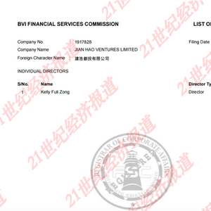 7月21日,21世纪经济报道记者从英属维京群岛金融服务委员会查询得知,娃哈哈争产案第二被告Jian Hao Ventures Limited(建浩创投有限公司)的唯一董事为宗馥莉。该决议及同意任职书最后存档的日期为2024年3月7日。