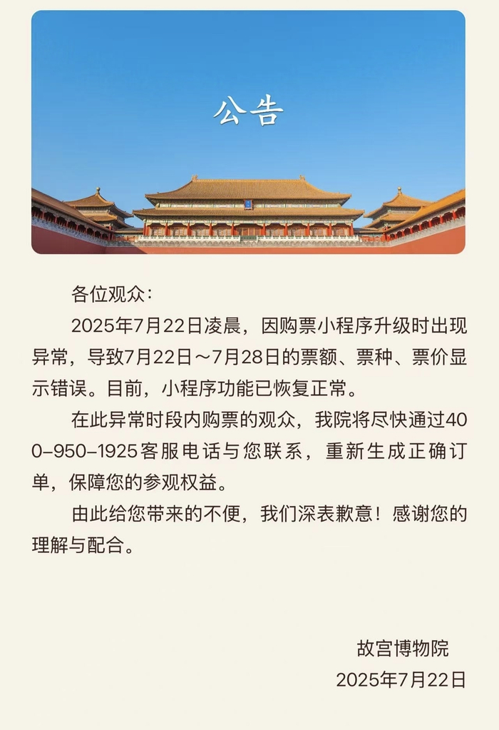 今天(7月22日)下午,不少抢到“低价票”的游客陆续收到了故宫博物院发来的短信。短信内容显示:因购票小程序升级时出现异常,导致2025年7月22日~7月28日的故宫门票票额、票种、票价显示错误。为此给您带来了不便,我们深表歉意!