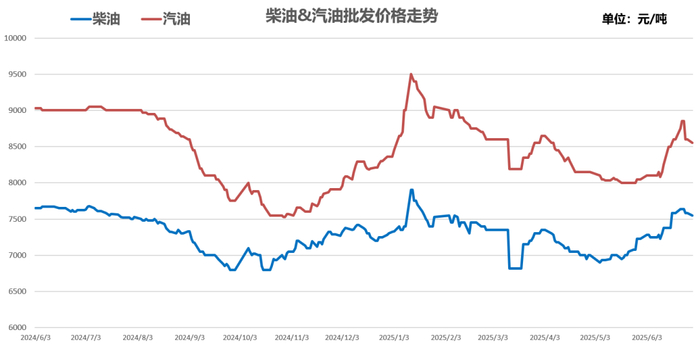 2025年6月,汽油及柴油价格均快速提升。截至月底,汽油及柴油批发价格分别达到8550元/吨及7550元/吨。