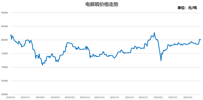 2025年6月,电解铜价格在月中小幅波动,月底有小幅提升。截至月底,电解铜价格达到80040元/吨。