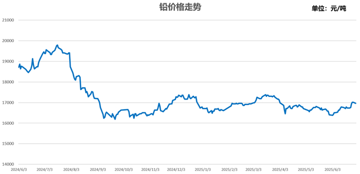2025年6月,铅价格呈现小幅波动且缓缓上升的趋势。截至月底,铅价格达到16960元/吨。