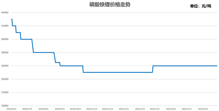 2025年6月,磷酸铁锂价格继续维持在36000元/吨,价格近4个月保持稳定。