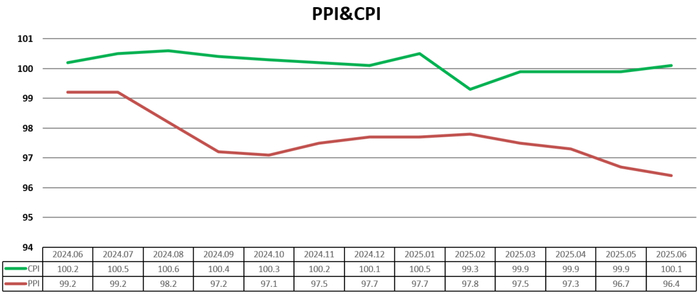 受环比下降及对比基数变动影响,PPI同比降幅比上月扩大0.3个百分点,但随着各项宏观政策加力实施,部分行业供需关系有所改善,价格呈企稳回升态势。一是全国统一大市场建设纵深推进带动部分行业价格同比降幅收窄。治理企业低价无序竞争力度加大,落后产能退出和产品品质提升逐步推进,汽柴油车整车制造、新能源车整车制造价格环比分别上涨0.5%和0.3%,同比降幅比上月分别收窄1.9个和0.4个百分点;光伏设备及电子元器件制造价格同比下降10.9%,降幅收窄1.2个百分点;锂离子电池制造价格同比下降4.8%,降幅收窄0.2个百分点。二是提振消费相关政策加力扩围带动部分生活资料价格同比回升。内需潜力持续释放,高品质生活需求增加,生活资料中一般日用品和衣着价格同比分别上涨0.8%和0.1%;耐用消费品价格下降2.7%,降幅比上月收窄0.6个百分点。从行业看,工艺美术及礼仪用品制造价格同比上涨13.1%,绢纺和丝织加工价格上涨1.2%,体育用品制造价格上涨0.7%。家用制冷电器具制造、家用美容保健护理电器具制造、电视机制造价格同比降幅比上月分别收窄0.8个、0.5个和0.3个百分点。三是新动能积聚带动部分高技术行业价格同比上涨。我国加快培育新质生产力,创新引领作用不断增强,高端制造、智能制造、数字经济等新动能持续发展壮大,集成电路封装测试系列价格同比上涨3.1%,可穿戴智能设备制造价格上涨1.4%,微波通信设备价格上涨1.3%,航空航天器及设备制造价格上涨1.1%,服务器价格上涨0.9%,微特电机及组件制造价格上涨0.6%。