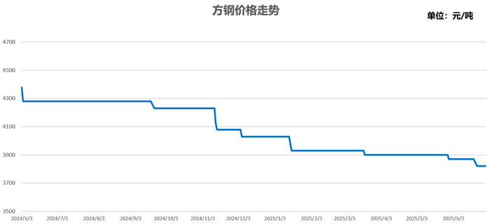 2025年6月方钢价格持续下降,达到3820元/吨。