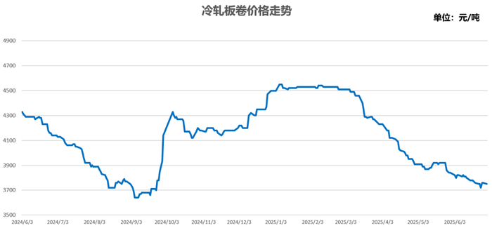 2025年6月,冷轧板卷价格继续下降。自3月开始价格在达到峰值后持续下降,降幅约17%。截至月底冷轧板卷价格达到3750元/吨。