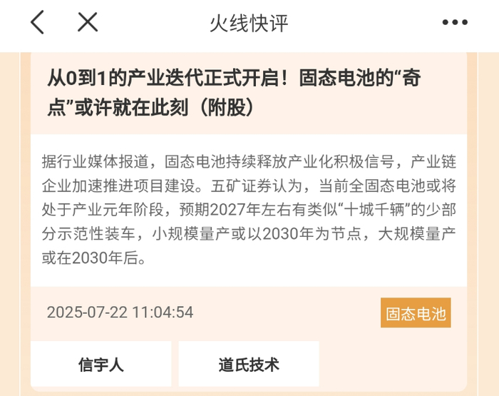 在每日经济新闻App私人订制的火线快评中,在7月22日,提到固态电池板块,相关个股走强。