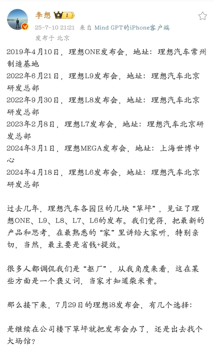 因此,李想将此次理想i8的发布会选在了和小米同一个地方。