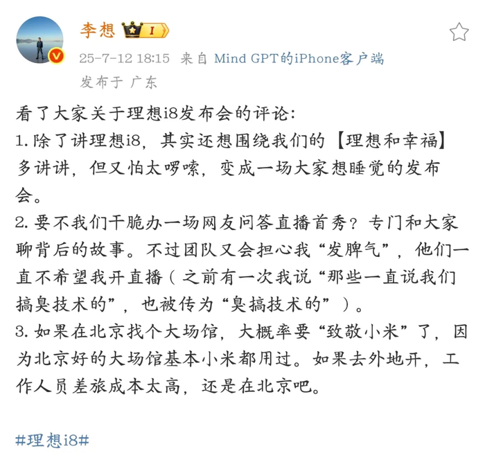 一开始,李想在微博上频频和网友互动,询问发布会场地选址、发布会内容、各种顾虑等问题,表示希望听到更多声音。