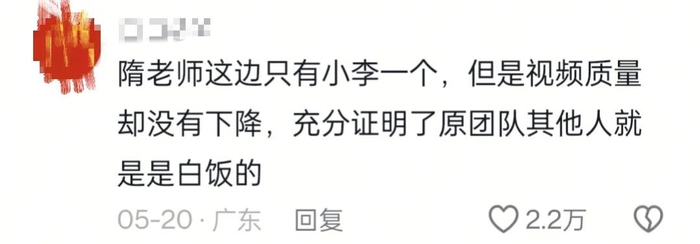还有网友扒出:MCN在声明里所说的声势浩大的“编导、摄像、剪辑、运营、商务专业团队”,这些事几乎全由隋坡助理“小李”一人身兼数职搞定(小李目前已和隋坡一起离开)。除此之外,唯一一个“真干活”的剪辑小姑娘还已经离职。