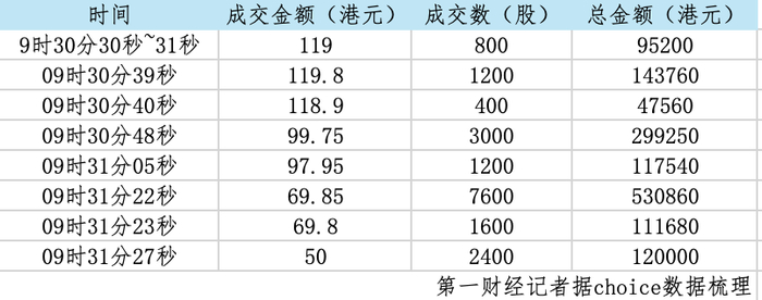 市场普遍认为,这是一起典型的“乌龙指”事件。华南某基金经理分析,这可能是交易员将19.9港元的买入价误输为119.9港元所致。除这笔交易外,当天9:30至9:32,该股还连续出现十多笔高价成交,涉及1.82万股,金额146.59万港元,从而进一步加剧了市场波动。