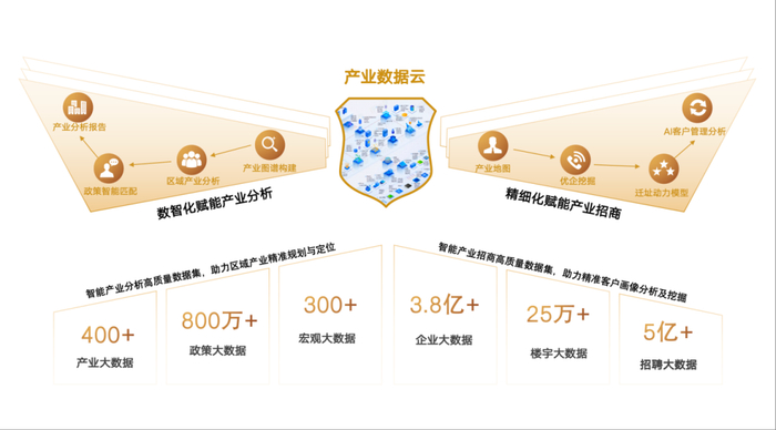 「产业数据云」整合了400+产业、800万+政策、3.8亿+企业、25万+楼宇、5亿+招聘等海量数据,构建智能产业分析与招商平台,助力区域产业精准规划、客户画像挖掘,为产业转型升级注入数智动力。