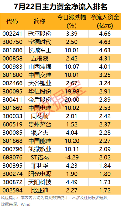 宁德时代、长城军工主力资金均净流入4.63亿元;其中长城军工涨停,净流入额创2018年8月27日以来新高。