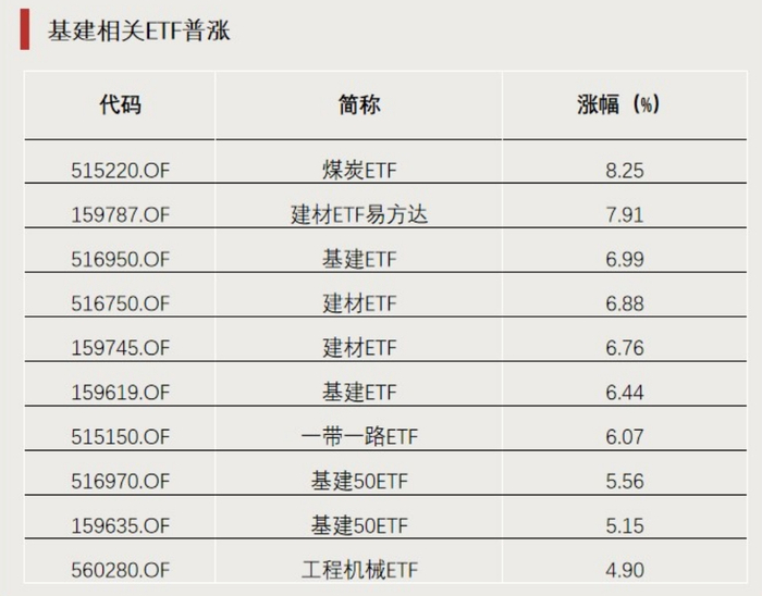 7月22日,A股三大指数集体上涨。水利水电建设、水泥等板块再度爆发。午后,煤炭、工程机械板块拉升。煤炭ETF(515220)以8.25%的涨幅领涨ETF市场,基建相关ETF普涨。