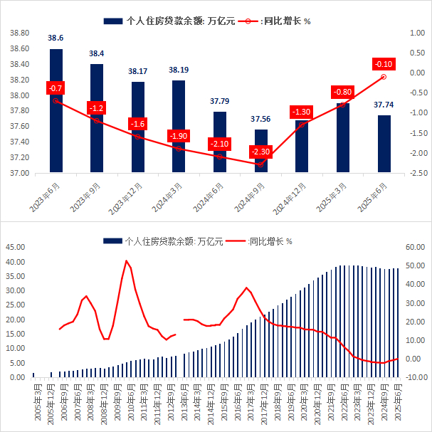 截止到2025年2季度,中国个人住房贷款余额为37.74万亿,低于1季度末的37.9万亿;跟去年2季度末相比降幅0.1%,这是连续第9个季度同比下降。个人住房贷款余额高峰是2022年2、3季度末的38.9万亿。