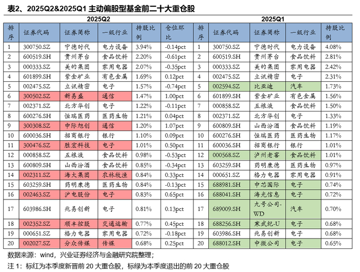 新易盛、中际旭创、胜宏科技、海大集团、沪电股份、顺丰控股、分众传媒新晋主动偏股型基金持仓的前20名。