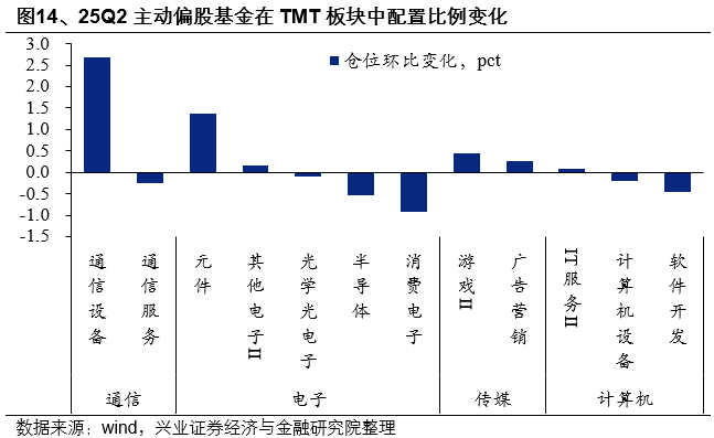 二季度,主动偏股基金加仓科技成长板块,并且主要布局上游算力与PCB等上游高景气方向。年初国产AI的实质性突破明确了其长期主线定位,但同时4月初关税冲击也影响了消费电子以及高弹性的TMT板块整体,与此同时25Q1电子板块配置已经接近20%,尽管主动权益进一步增配科技成长,但对于性价比、安全边际的要求也有所提升,因此在海外算力高景气的映射下,业绩确定向较高的通信设备、元件等板块成为科技板块内部增配的主要方向。