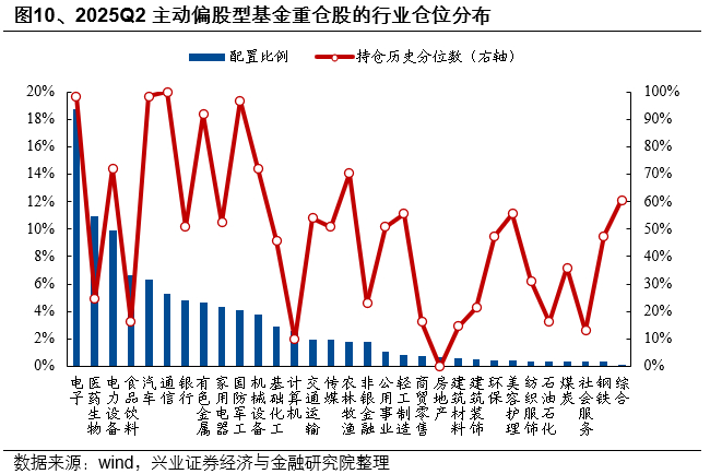 从一级行业超配比例来看,主动偏股型基金超配电子、医药生物、电力设备、家用电器、食品饮料。2025Q2主动股票型基金的重仓股超配前五的行业分别是电子、医药生物、电力设备、家用电器、食品饮料,超配比例分别为9.67%、4.44%、4.15%、2.50%、2.13%。超配比例后五的行业分别是银行、非银金融、石油石化、公用事业、计算机,低配比例分别是 -9.71%、-5.14%、-3.27%、-2.23%、 -1.80%。从分位数来看,电子、国防军工、汽车、有色金属、钢铁等的超配比例的历史分位数较高,计算机、食品饮料、社会服务、公用事业、房地产等处于历史较低水平。