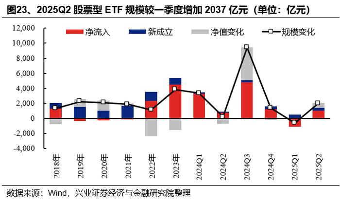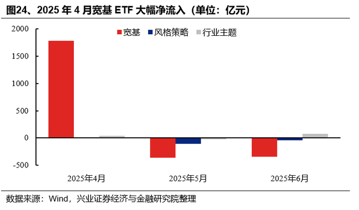 从股票型ETF规模变化拆分来看,4月资金的大幅流入是主要贡献。2025年二季度股票型ETF规模较2025年一季度增长2037亿元,其中资金净流入规模/新成立ETF规模/存量ETF净值变动分别为1033亿元/384亿元/620亿元。