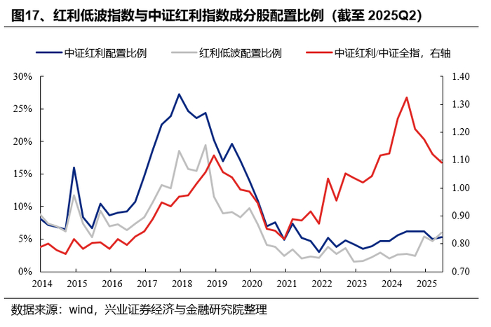 在银行、非银板块仓位提升驱动下,红利低波指数和中证红利指数配置比例均小幅上升。偏股基金重仓股中持有红利低波指数上升0.23pct至5.25%,持有中证红利指数成分股仓位上升1.27pct至6.00%。