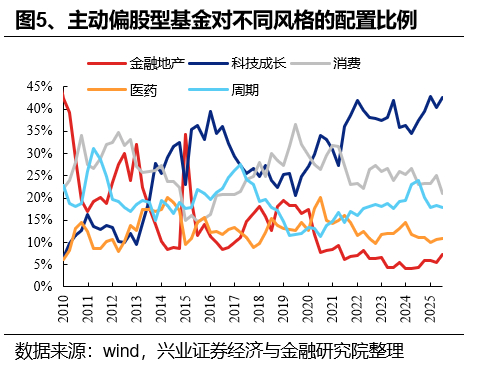 2025年二季度,主动偏股基金加仓科技成长、金融地产、医药,相对应的,主动偏股基金在消费、周期上的仓位下降。2025Q2,主动偏股型基金对科技成长、金融地产、消费、医药和周期的配置比例分别为42.68%、7.31%、21.08%、10.93%、17.89%,较上一个季度的变化分别为+2.30pct、+1.81pct、-3.92pct、+0.34pct、-0.54pct。此外,主动偏股型基金对科技成长、金融地产、消费、医药和周期的超配比例分别为14.84%、-15.27%、6.30%、4.44%、-10.31%,较上一个季度的变化分别为+2.49pct、+0.29pct、-2.97pct、+0.25pct、-0.07pct。