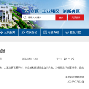 7月22日0时至5时,莱芜区遭遇强降雨天气过程,最大点降雨量达364毫米。受其影响,大王庄镇石屋子村、朱家峪村附近发生山洪灾害,冲毁及损坏房屋19套,造成2人死亡、10人失联。目前,正在全力搜救失联人员,有序开展灾后救援及善后工作。