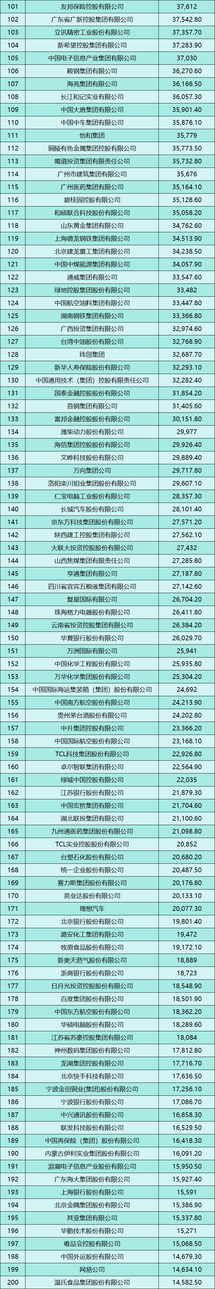 从盈利能力方面来看,在最赚钱的40家上榜公司里,腾讯以超过269亿美元的净利润排在第6位,阿里巴巴以超过180亿美元的净利润排在第9位,拼多多第11位、京东第27位、美团第31位。