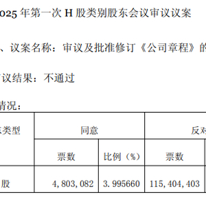 投票结果显示,《公司章程》修订案获得H股股东同意票480.31万股,占(出席会议有表决权H股股份总数)近4%;反对票1.15亿股,占比约96%。《股东会议事规则》修订案获得H股股东同意票1972.81万股,占比约16.41%;反对票1亿股,占比约83.59%。