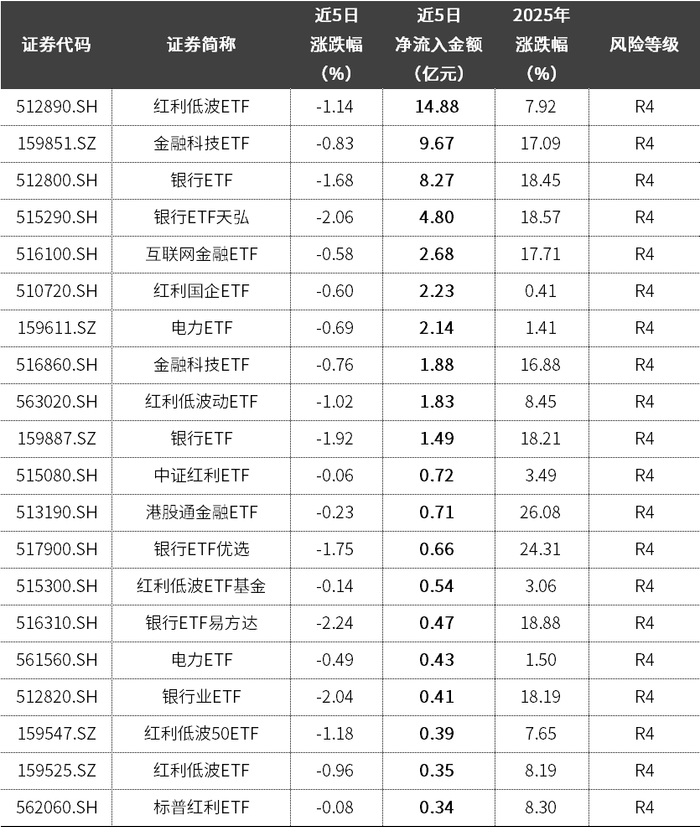 落地到ETF市场,资金逆势买入30多只。其中,跟踪红利低波指数的1只ETF获超10亿元资金净买入,获超亿元净买入的ETF则有10只。