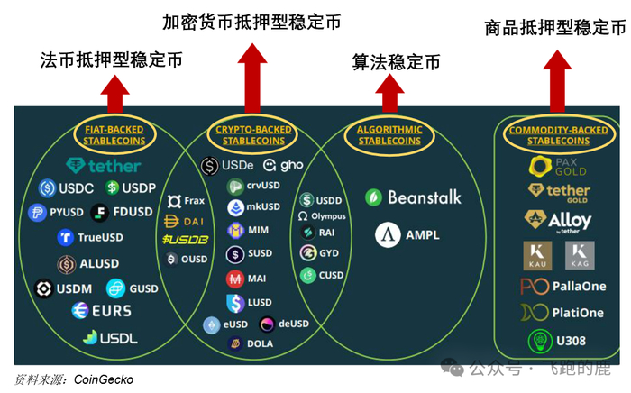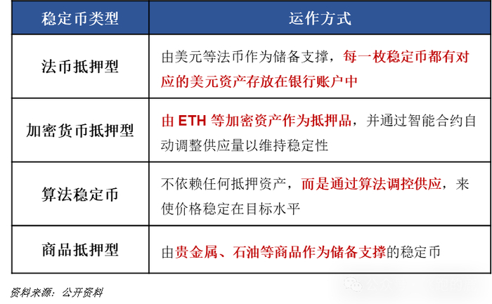 稳定币主要分为四大类:法币抵押型、加密货币抵押型、算法稳定币和商品抵押型。其中,法币抵押型是当前主流,以USDT和USDC为代表,其价值通过美元、美债等传统资产作为抵押物支撑。