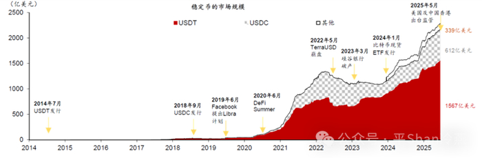 - 2014年,USDT诞生,初期主要服务于加密货币交易,凭借先发优势奠定市场地位。