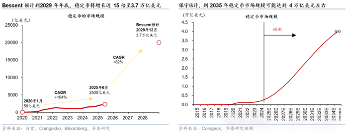 美国财政部长贝森特近期表示,到2029年年底稳定币市值将增长近15倍,达到3.7万亿美元(隐含CAGR约80%)。稳定币除了用于交易加密资产之外,在全球商品与服务交易中的占比、作为价值储存手段的应用,以及居民持有渗透率等多个维度均呈现快速发展态势,未来有望在数字金融领域发挥更重要的作用。