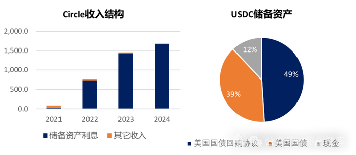 从业务收入来看,目前主要依赖储备收入和其他业务。储备收入占比超99%。Circle的商业模式极其简单,就是依托用户存入的法币储备金(美元)获取利息收益。USDC的储备资产主要投向是美债,随着美联储在2022年大幅加息,公司的收入在2022年出现爆发式增长。2022-2024年,该收入占比分别达95%、99%、99%,金额从7.36亿美元增长至16.61亿美元,盈利持续增长。